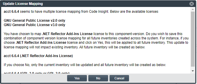 The Update License Mapping window provides the option to save your new license mapping at the system level so that all future inventory system-generated for the component version across projects will be associated with the license. The window also explains what happens when the mapping is save at the system level to help you make an informed decision.